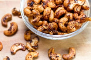 - Mix the first six ingredients together in a small bowl. Add the cashews and toss them around to fully coat them in the spice mixture.