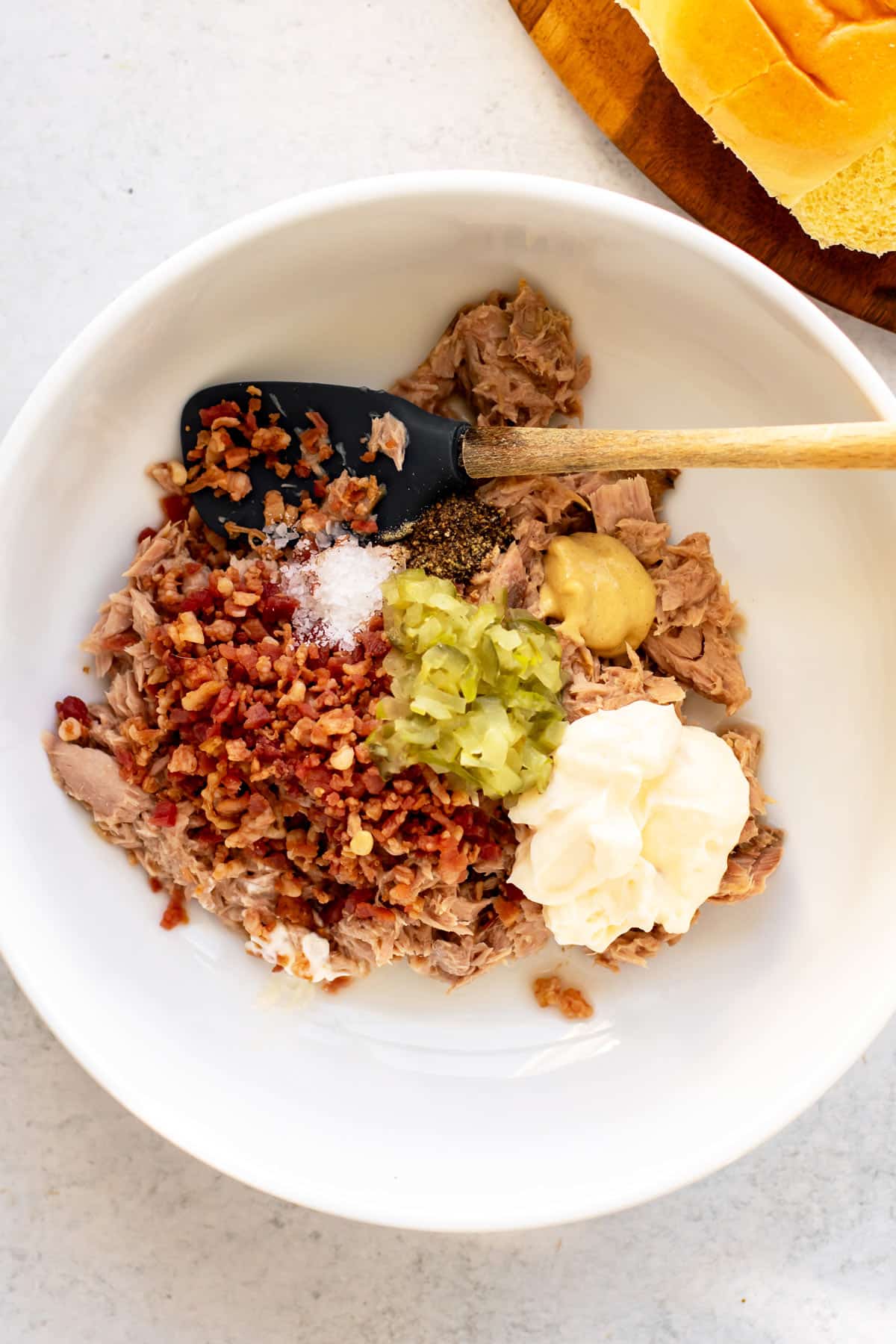 In a bowl, mix together the tuna, mayo, relish, mustard, and bacon until everything’s well combined.