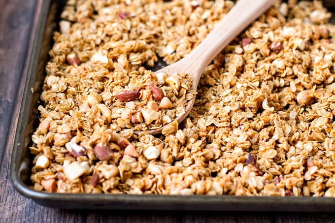 - Once cooled remove the granola from the baking sheet and store in an airtight container. It will keep for up to one week.