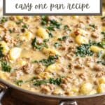 This sausage gnocchi skillet – inspired by the flavors of Zuppa Toscana– is a hearty one-pan dinner made with Italian sausage, fresh kale, and tender gnocchi in a creamy sauce. Itโs incredibly easy, but tastes like it simmered much longer than it did. It’s the best kind of cold-weather comfort food.