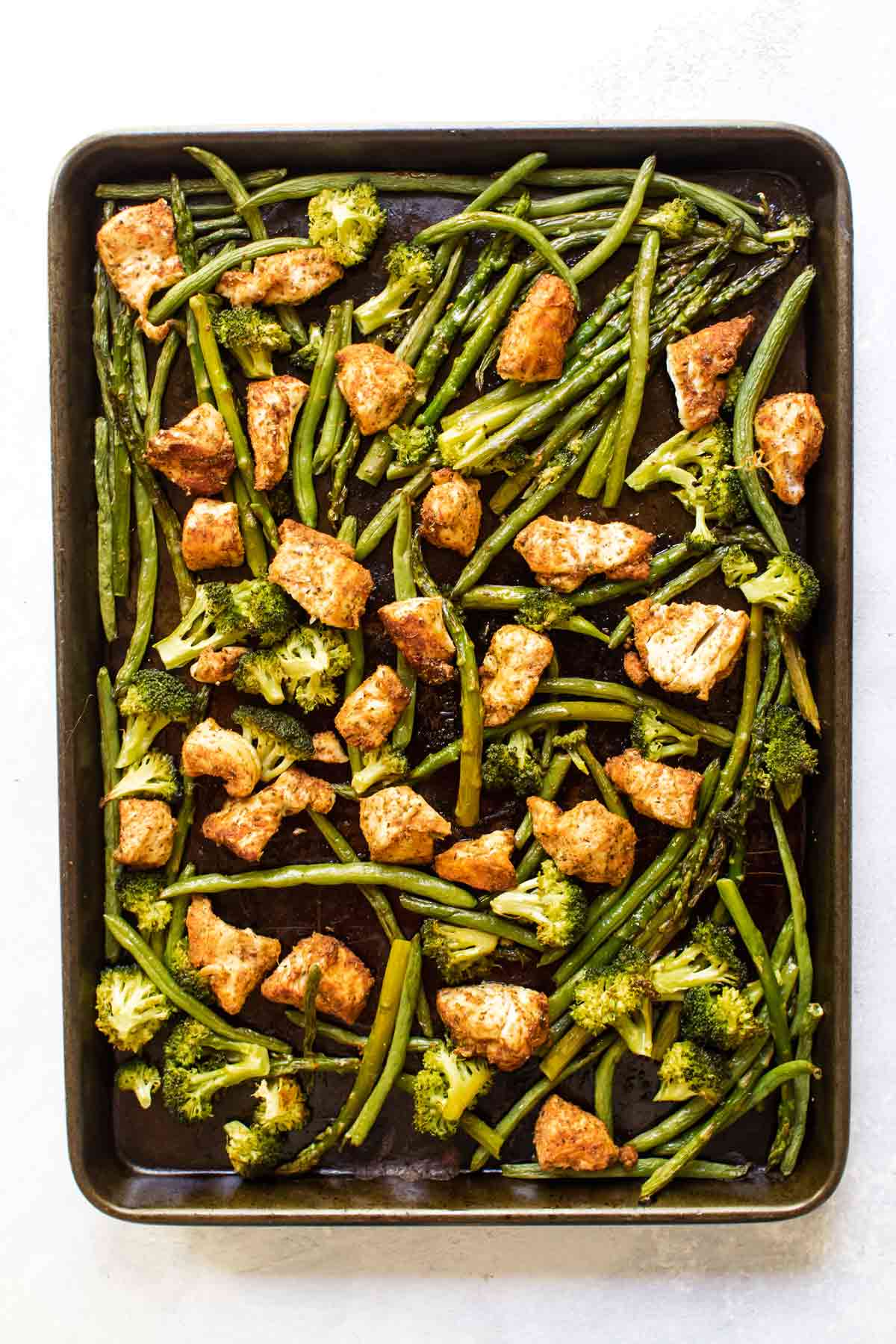 If it’s light and healthy-ish you crave, this one pan chicken and veggies is what you need. It’s a medley of green veggies with paprika-seasoned bites of chicken that cooks on one sheet pan all at the same time. Magic!